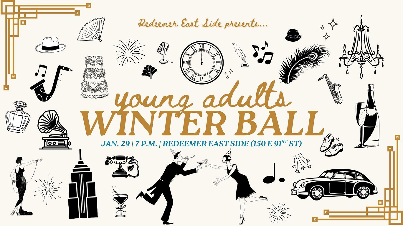 EVENT DESCRIPTION: Welcome to the Roaring 20’s (Our Version)! Dust off your dancing shoes for Redeemer East Side’s first Young Adults Winter Ball. Join us for an evening of glitz, glam, and good company. We’ll enjoy dinner, drinks, and swing-dancing lessons before dancing the night away. Dress in your best 1920s-inspired attire—prizes await the best dressed! Bring a friend and get ready to groove!