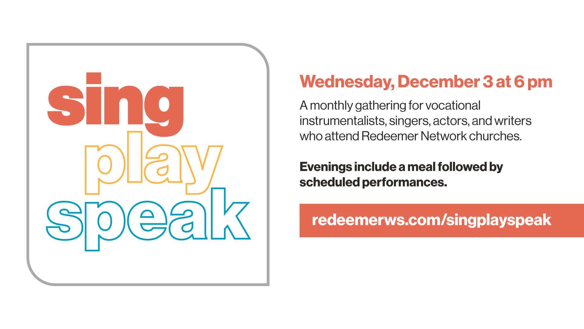 Are you a vocational singer, instrumentalist, actor, or writer? Looking for an opportunity to share your work in front of a network of peers? Register for Sing, Play, Speak, a monthly gathering of working artists who follow Jesus in NYC, designed to create community and encouragement. Evenings include a meal followed by performances. Dinner is from…